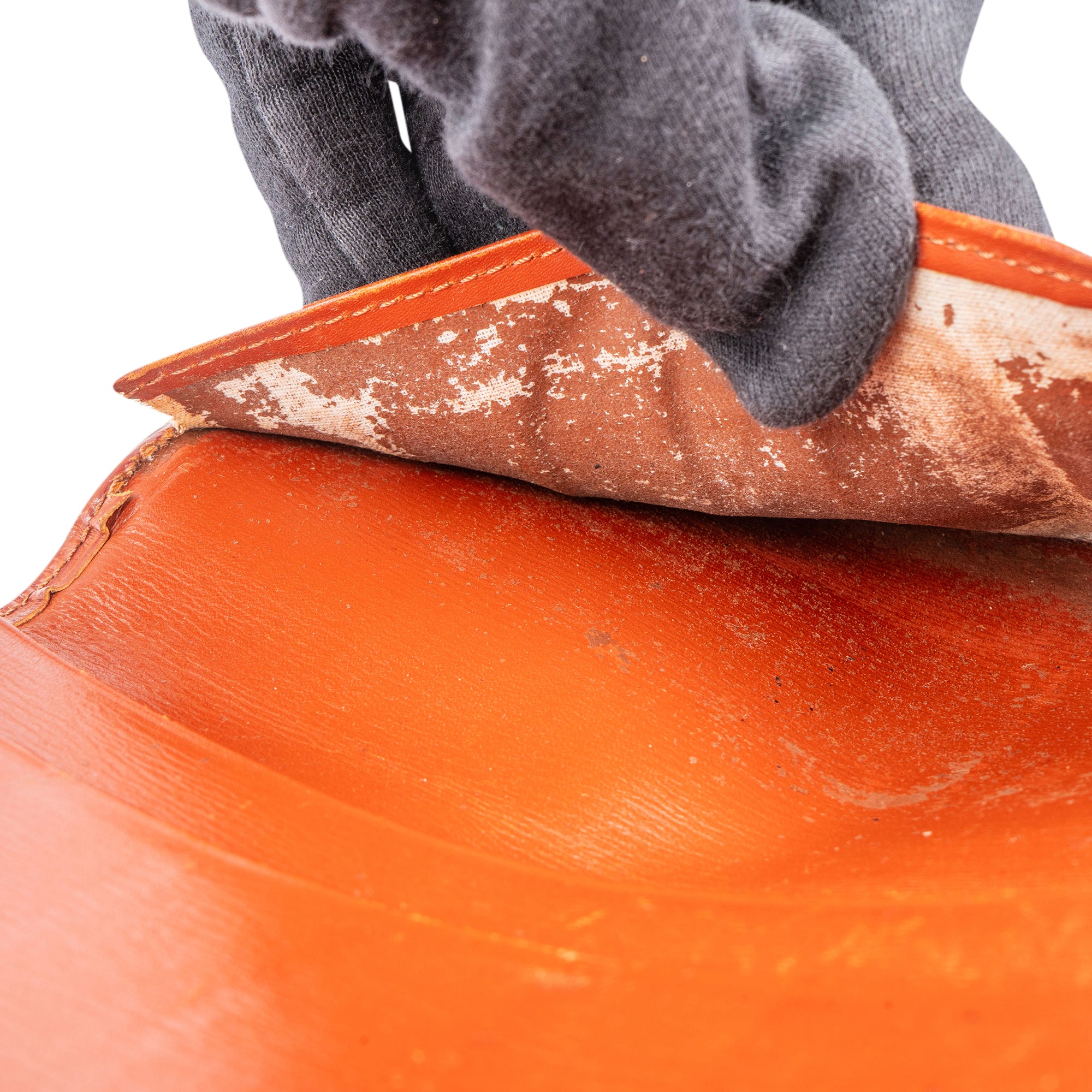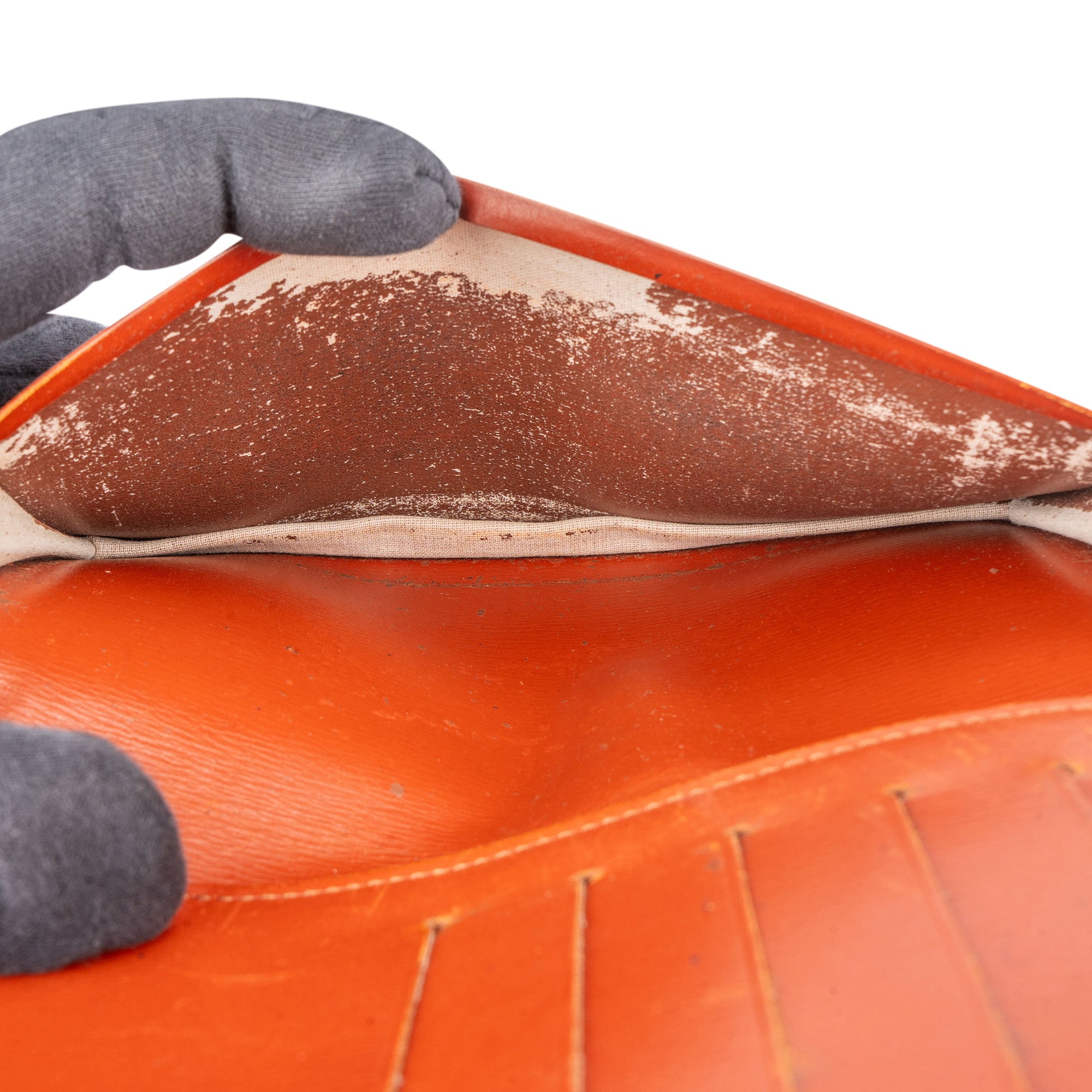 Zustand innen: mit Abrieb und an einem Fach eingerissen