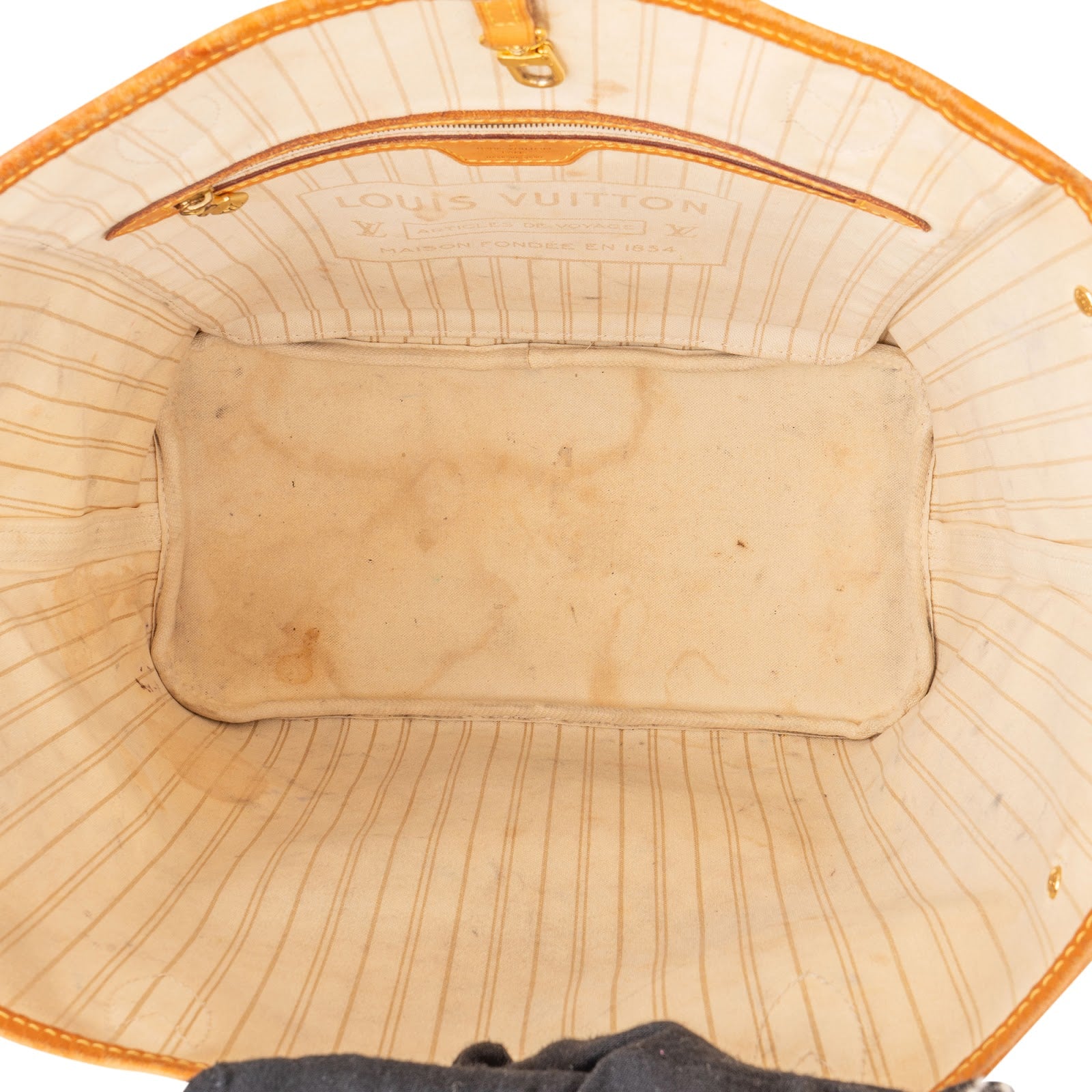 Zustand außen: sehr gut - Vachetta-Leder mit Abrieb und Patina, mit Abrieb am Canvas (primär an den Ecken), Personalisierung an den Trägern (L.V) und (C.Q)