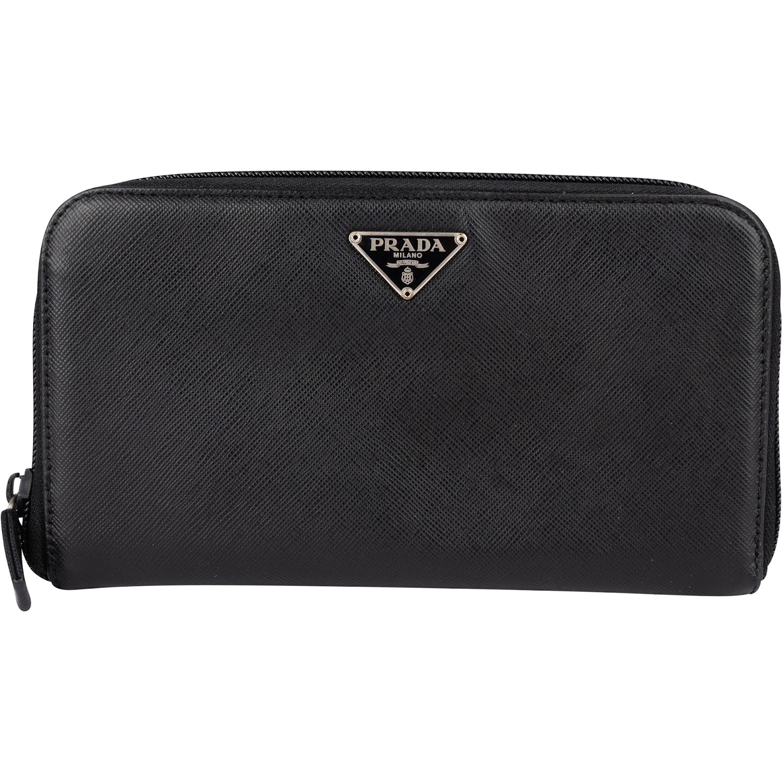 Prada Black Saffiano Leather Triangle Zip Around Wallet