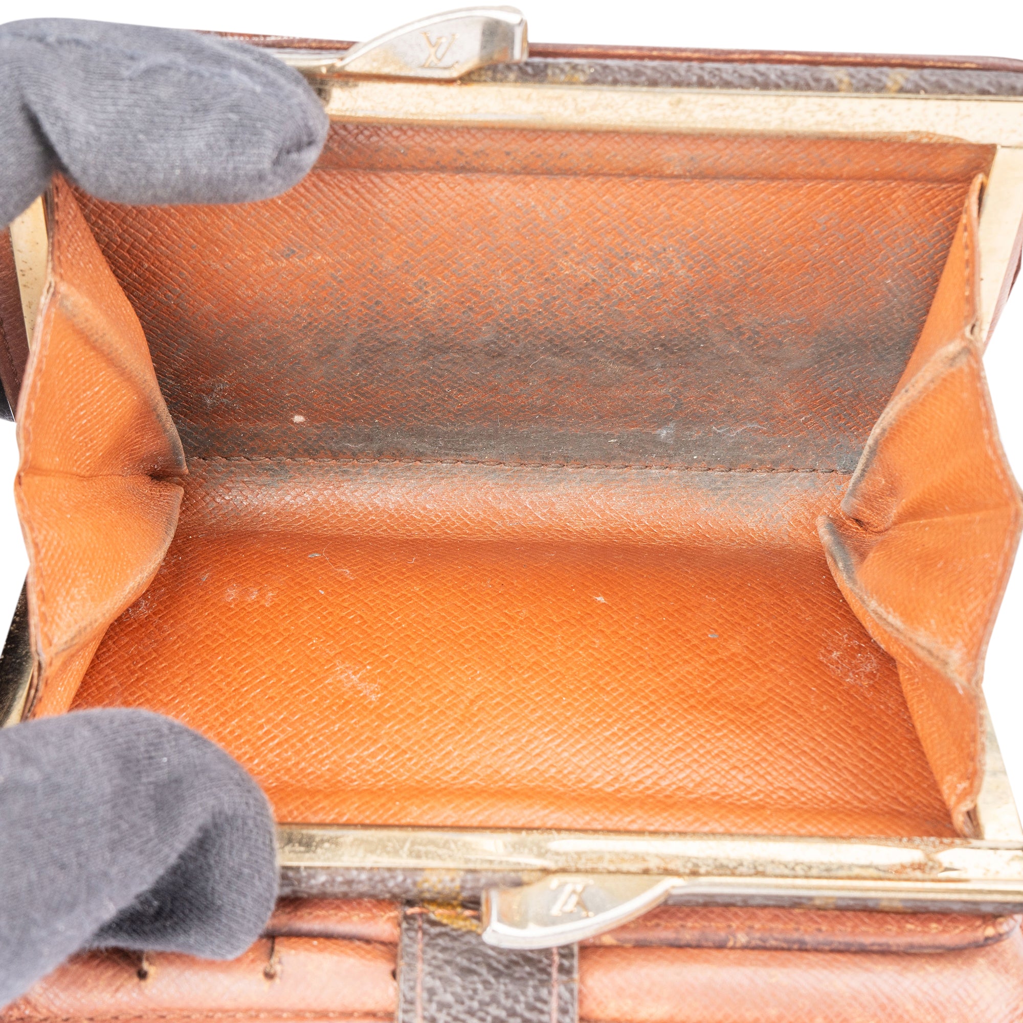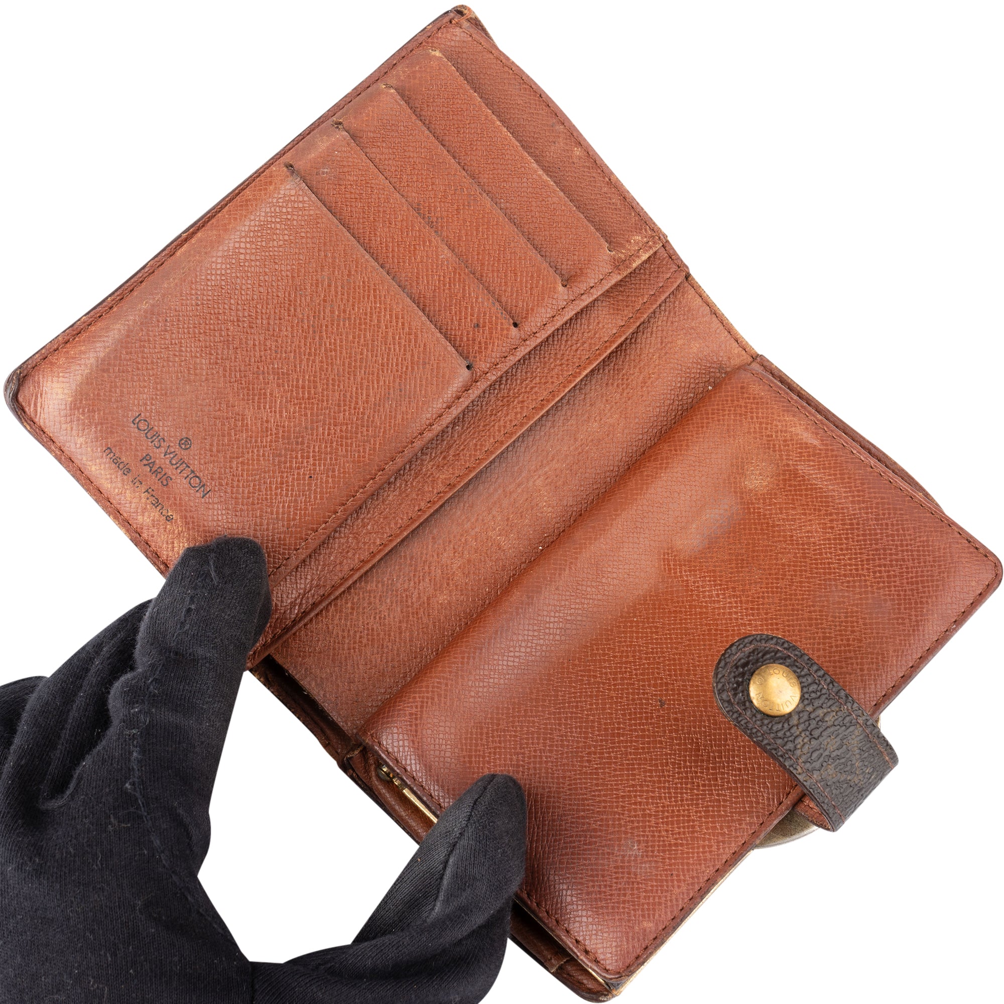 Zustand innen: Material mit Abrieb und Makel, am Scheinfach eingerissen